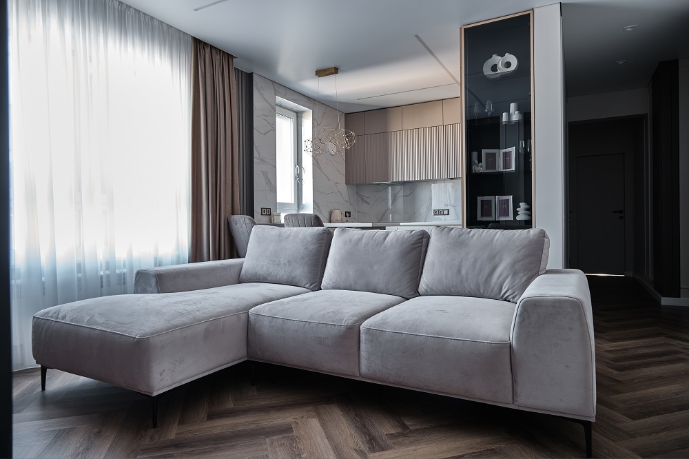 Тот случай, когда серый диван является дополнением к молочному интерьеру, где общая картина рисуется наполнением домашними деталями: зелёным креслом, деревянной мебелью, картиной с синим фоном и кварцевым ламинатом Дуб Норден, уложенным ёлочкой, на полу.