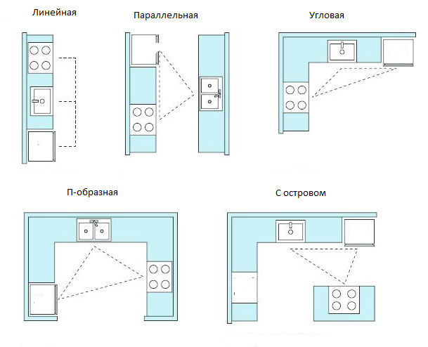Правило треугольника заключается в том, что три эти «угла» должны находиться примерно на равном расстоянии друг от друга и в идеале приближаться к пропорциям равностороннего треугольника. Тогда перемещаться между главными задачами на кухне вам будет легко и комфортно, а главное - быстро.